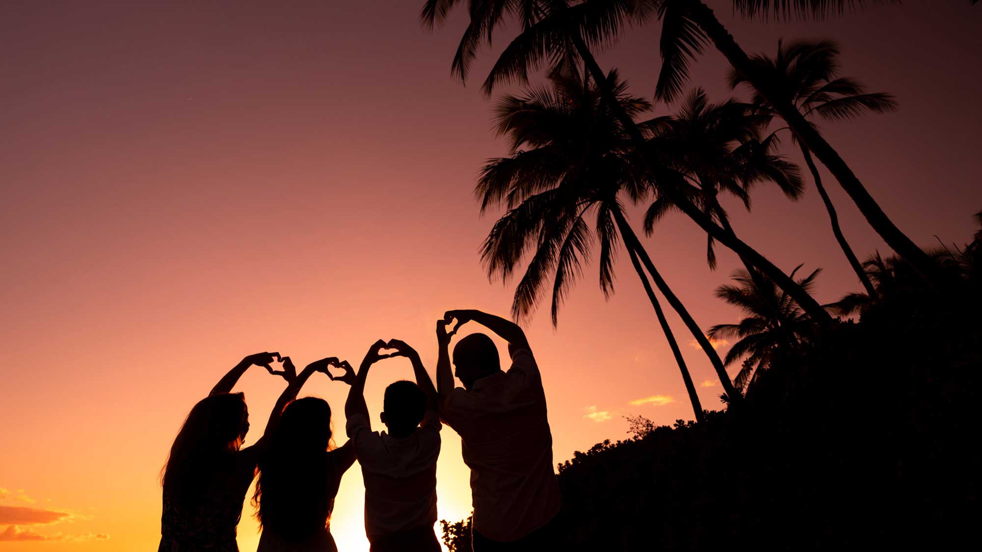 Landmarks: Long stretch of sand, lots of palm trees, and sun setting above the water.