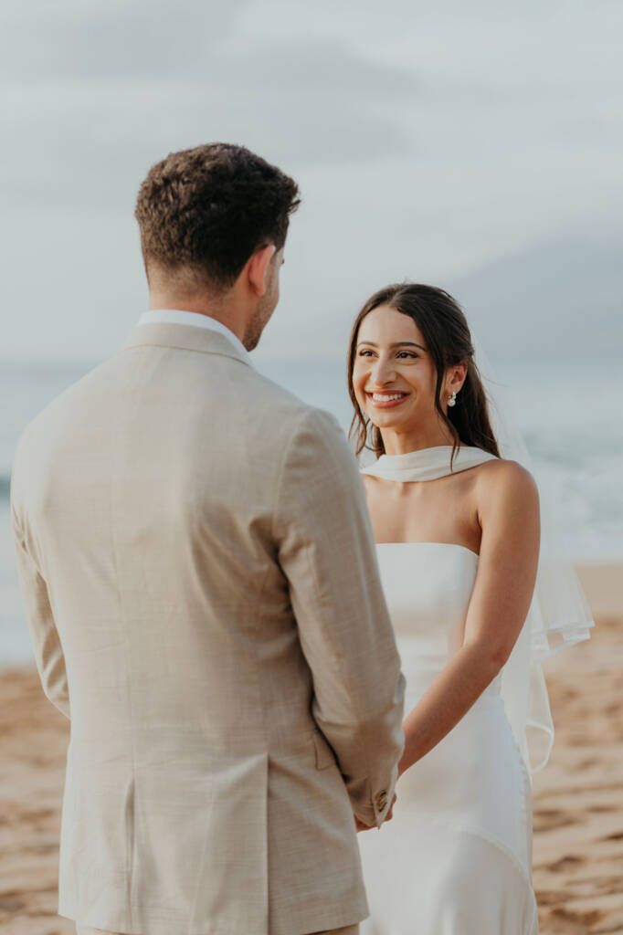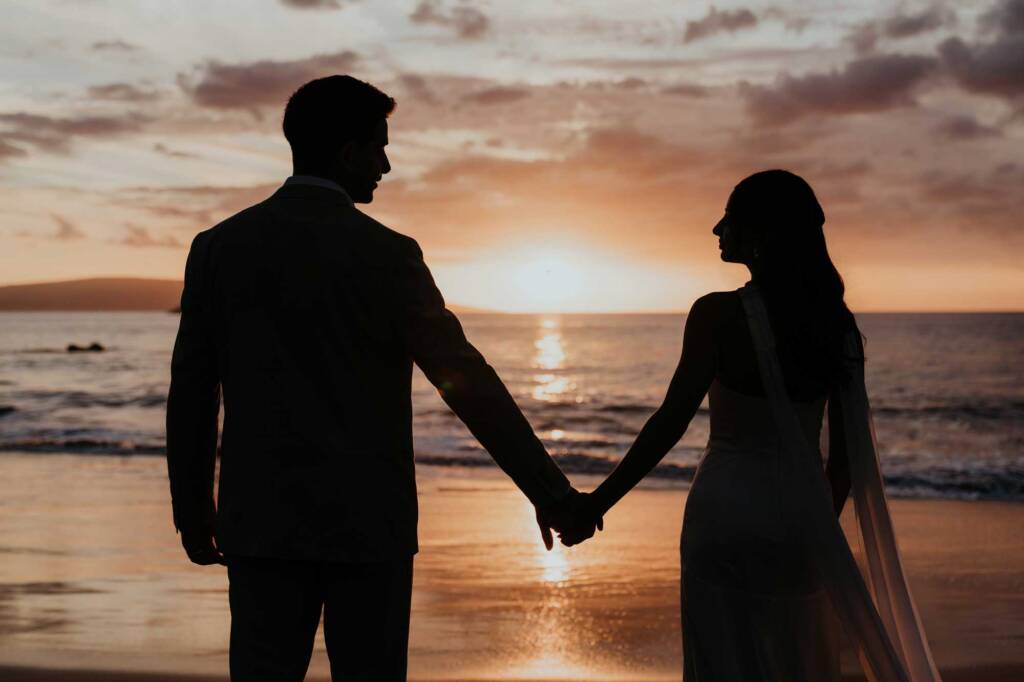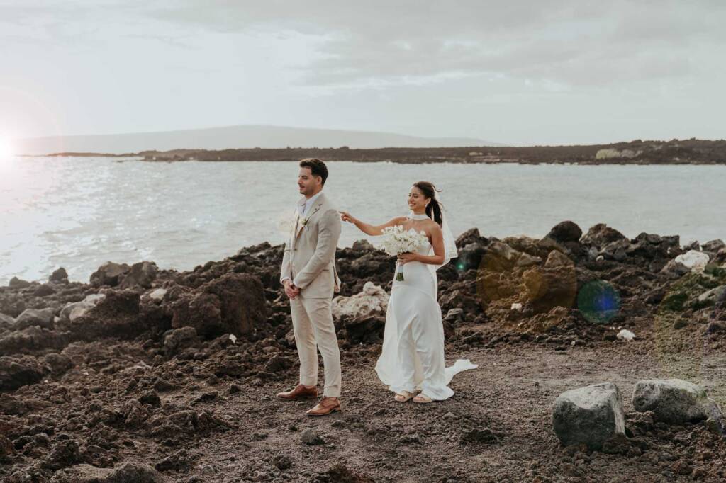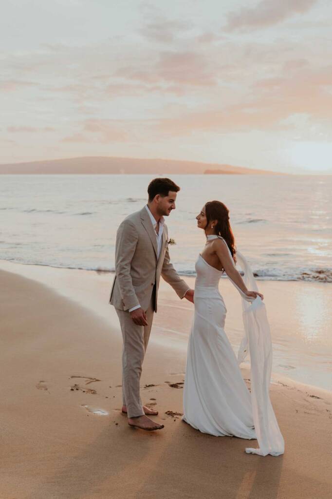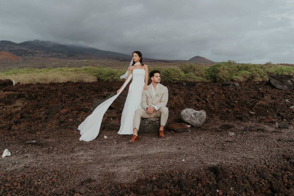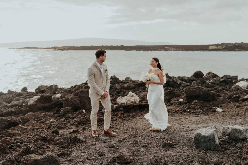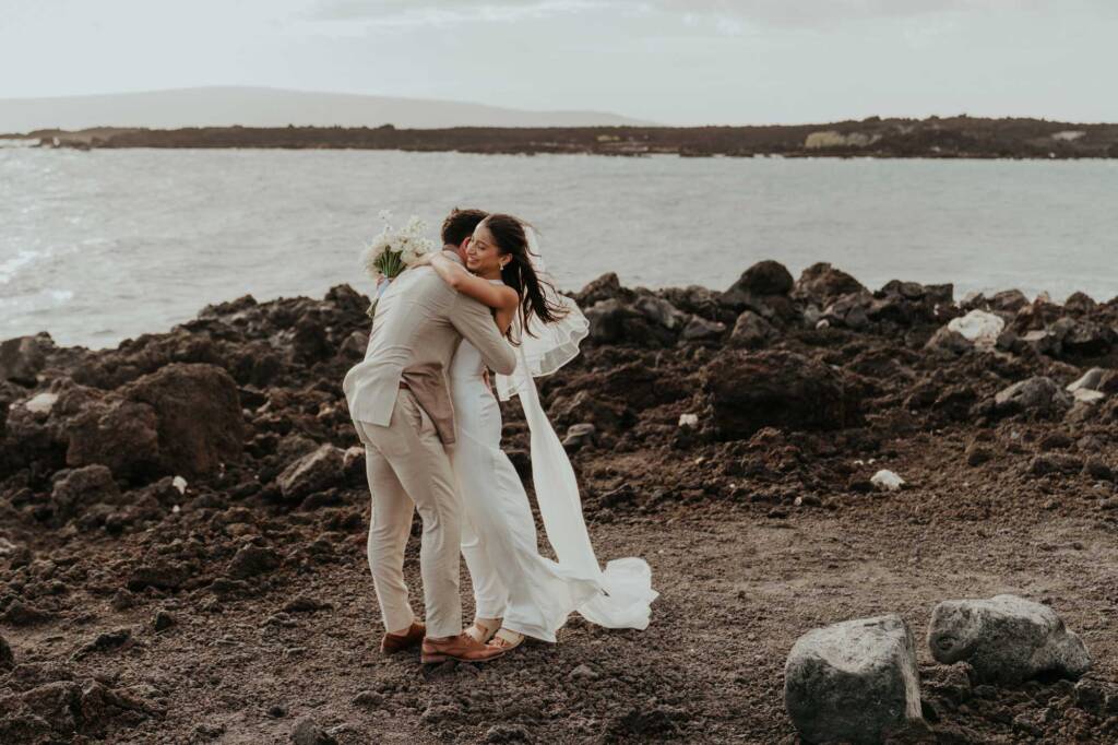 Their elopement unfolded across two locations in South Maui, blending dramatic volcanic scenery with a quiet beach ceremony at sunset.