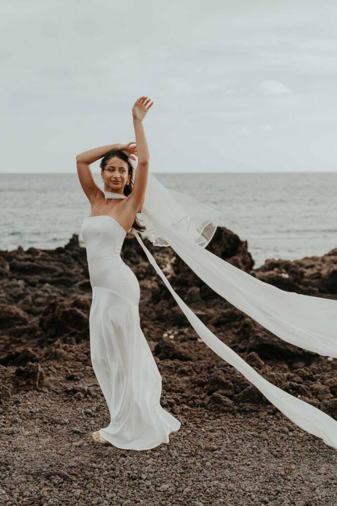 The first look location, chosen by the couple from our curated list of Maui beaches, is known for its raw lava rock formations, and the combination of ocean and mountain views.