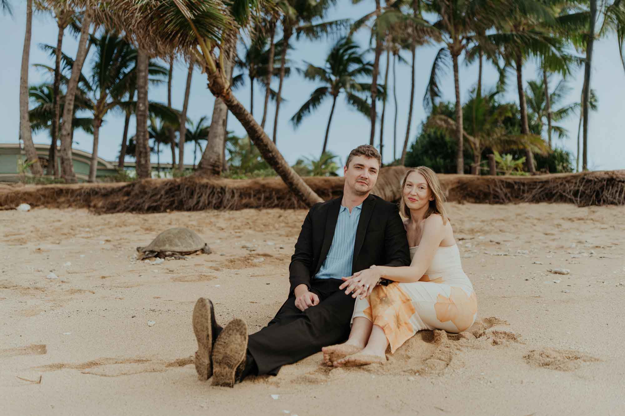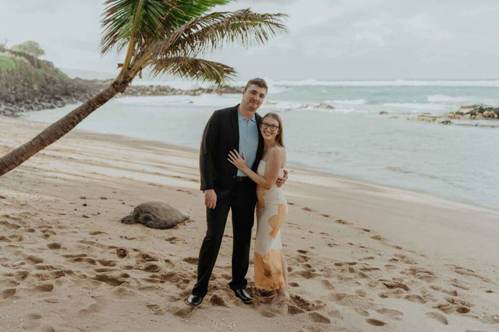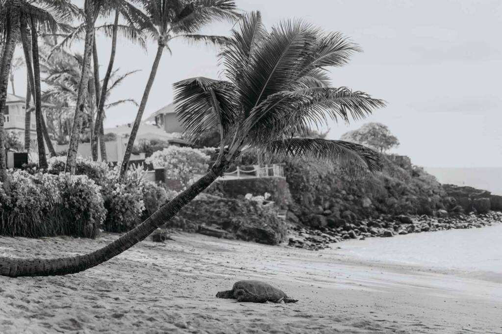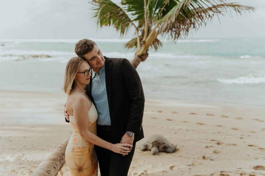 A sea turtle appeared near the shoreline, resting beneath a coconut tree just steps away. Joseph and Julia later shared that turtles hold a special meaning for them. They had already swum with turtles earlier, making this unexpected appearance feel deeply symbolic.