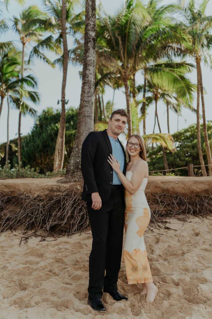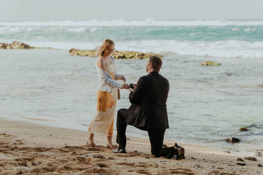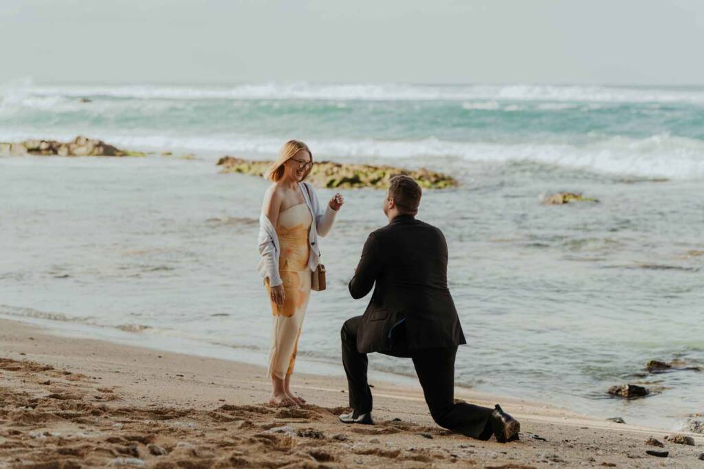 As Joseph dropped to one knee, the moment unfolded quietly and naturally. No crowds. No distractions. Just the sound of the ocean, the wind moving through the palms, and two people fully present with each other.