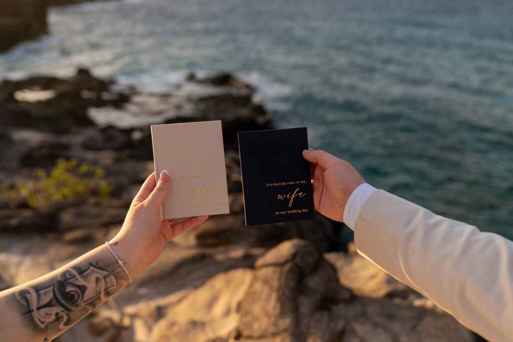 They stood together near the shoreline reading vows written on paper, speaking directly to each other without an audience.