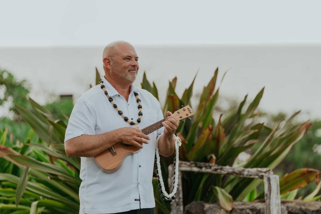 After the lei exchange and traditional vows, he pronounced them husband and wife and immediately shifted into their first dance — playing the ukulele as the waves rolled in behind them.
